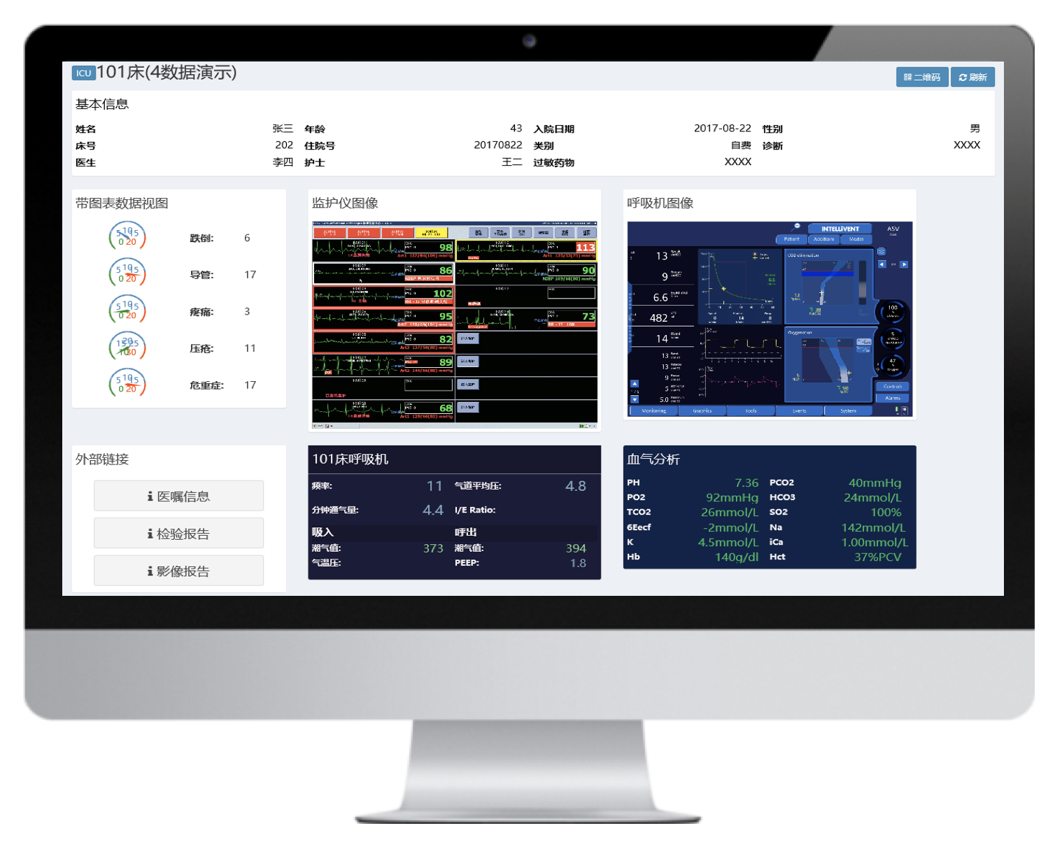 多臺不同品牌的有創呼吸機聯網,并通過大屏實時集中呈現治療預設參數和監測參數,實現多臺集中監測、集中管理和數據存儲。